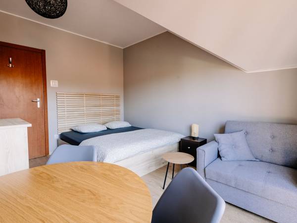W pokoju znajduje się oczywiście łazienka, mały aneks kuchenny, zestaw do parzenia kawy i herbaty, ręczniki.