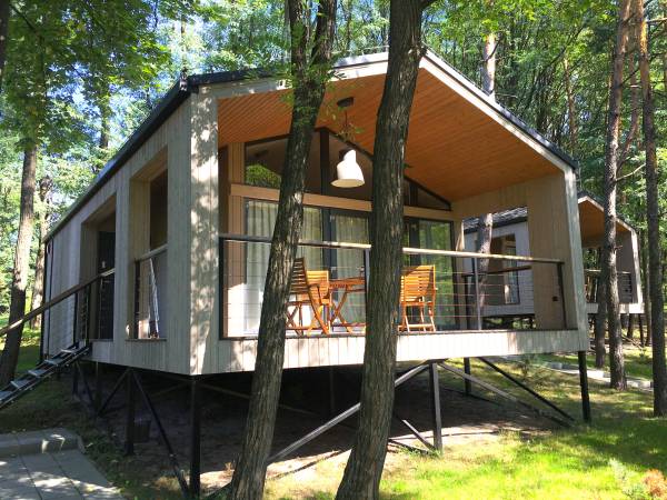 Całoroczny Domek dla 4 osób, z kominkiem i tarasem wśród drzew, z widokiem na las, 2 sypialnie. Wyposażona kuchnia, WiFi, klimatyzacja, ogrzewanie podłogowe.